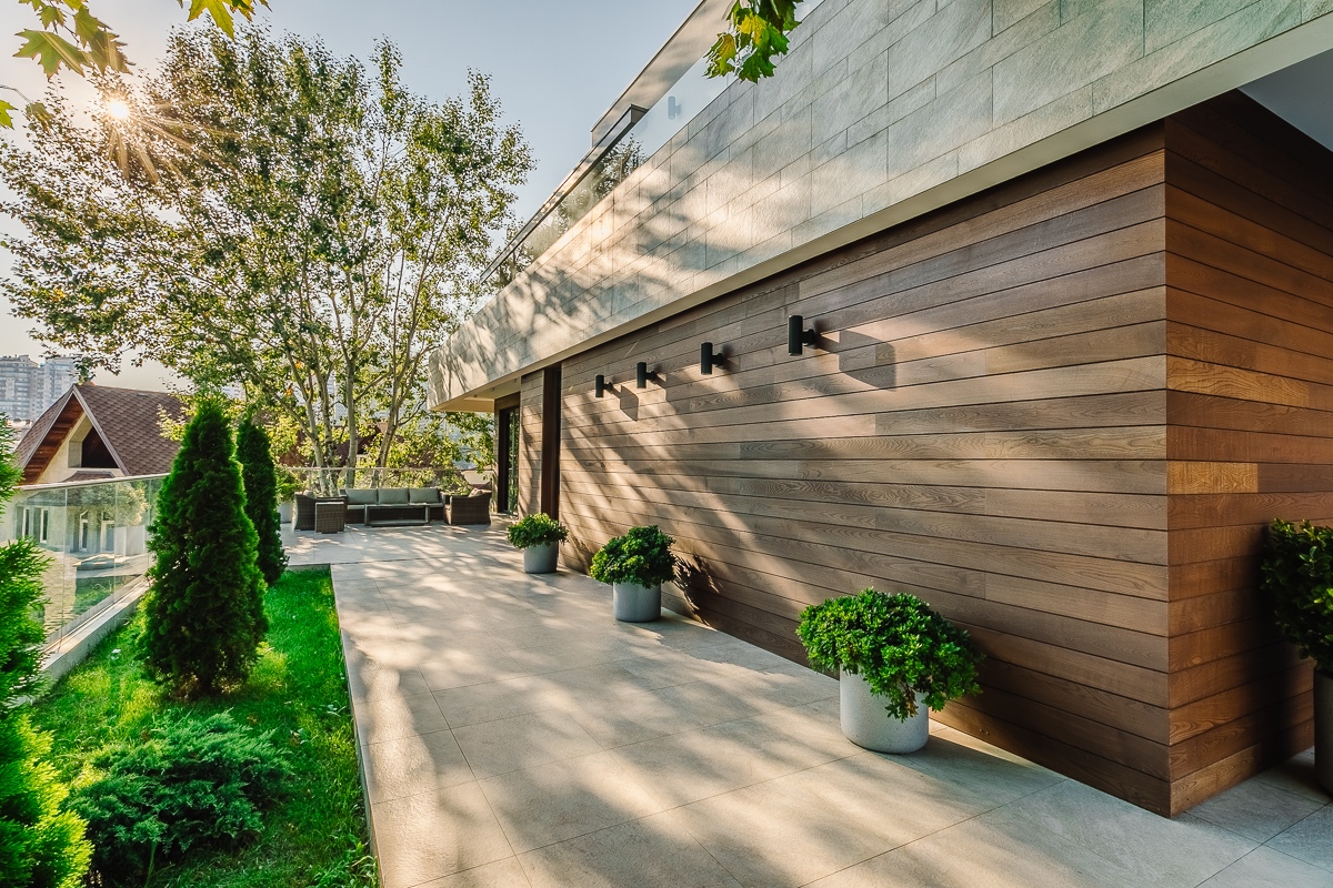 На участке выполнены все ландшафтные работы и озеленение, сделана архитектурная подсветка Общая площадь дома, включая террасу на первом этаже, 545 м2